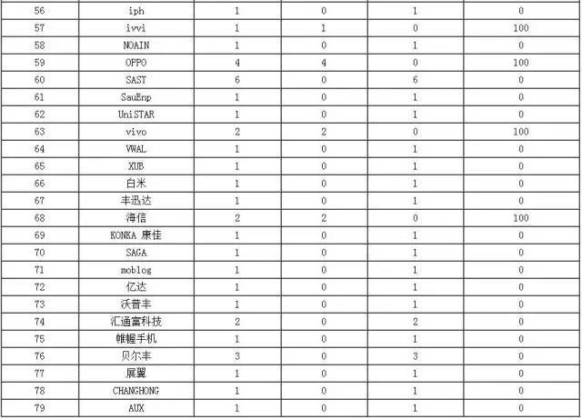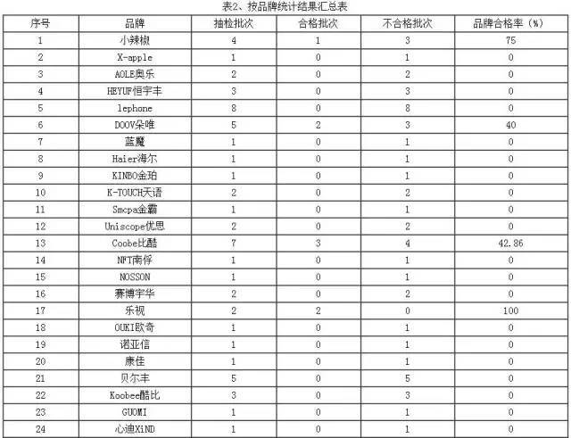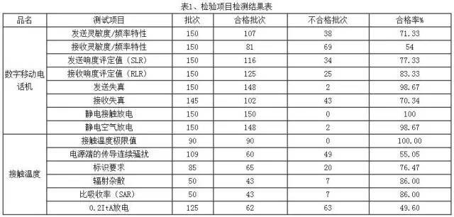 江苏省工商行政管理局官网近日发布公告,该局组织力量对全省流通领域数字移动电话机质量进行抽检,主要涉及南京、南通、淮安、沐阳、宿迁、苏州和泰兴等7地,检验项目主要有:发送灵敏度/频率特性、接收灵敏度/频率特性、发送响度评定值、接收响度评定值、发送失真、接收失真、静电接触放电、静电空气放电、接触温度的限值、传导连续骚扰、标识要求、辐射杂散、比吸收率(SAR)、0.2ItA放电(见表1)。本次共计抽检200批次,合格81批次,合格率为40.50%。