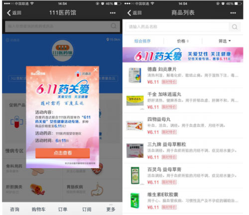 6月11日,百度药直达联合111医药馆望京区域5家店,正式推出“6.11药关爱”关爱职场女性、优惠购药活动,用户通过手机百度搜索“药店”即可进入女性关爱专场,全场任一款活血调经女性专属药品都是6块1毛1。当天下单,用户还可享受一小时快速送药上门服务。