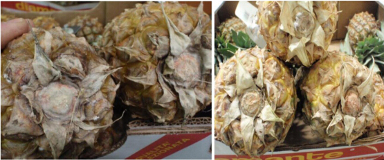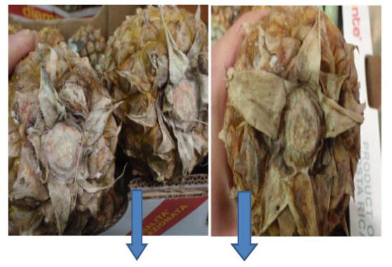 两周后,我们拿出四箱菠萝,以下是我们所看到的结果。没有喷洒PIP Air Purify的菠萝