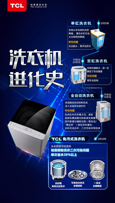 TCL作为中国家电品牌的国际大咖企业,虽然作为洗衣机领域的小兄弟品牌,从开始专注洗衣机产品以来,力求从高研发入手,历经三年汇集行全球业顶尖专家通过近8000次实验,终于解决了技术难点,2016年3月亮相研发出一台免污式洗衣机,从根本上完全解决了机器长久污水洗衣的难点问题,真正意义的实现了洗衣既便捷,又洁净的洗衣问题。TCL免污式洗衣机虽然从产品本身而言还是一台洗衣机,但是这台洗衣机从根本上解决了洗衣真正无污染,实现了真正洗衣干净的多年困扰问题,成为洗衣机领域一个全新品类,业内人士对TCL免污式洗衣机称为“洗衣机行业划时代的里程碑之作”。