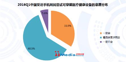 在中国移动医疗健康的诸多设备产品中,大众接受度最高的产品便是可穿戴医疗健康设备了。艾媒咨询报告显示,2015年中国智能可穿戴市场已达105.6亿元。超过半数的移动医疗健康用户表示已体验过可穿戴医疗健康设备。移动医疗健康用户对可穿戴医疗健康设备也普遍持有较为正面的态度,33.9%的中国手机网民表示一定会尝试可穿戴医疗健康设备,60.5%的用户则表示看具体需求而定,只有5.6%的网民坚决表示不会尝试。