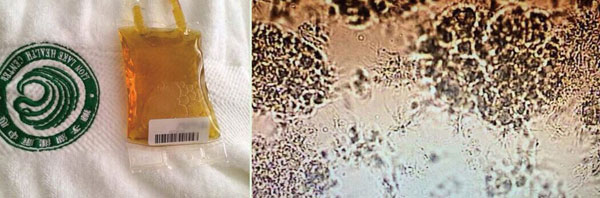 塑料袋内为客人排出的毒素,其中颜色浑浊的絮状物即为蓄积在人体内的重金属及其他有害毒素,排出物含有大量的坏胆固醇、甘油三酯等。