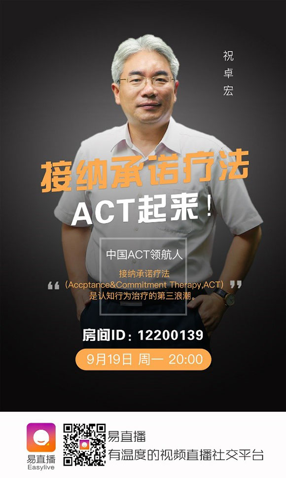 今晚八点,易直播联合暖心理,邀请中科院心理所著名心理学教授祝卓宏做客易直播(易直播ID:12200139),在线上和你线上面对面,分享最前沿的心理学疗法:接纳承诺疗法和他的新书《ACT,就这么简单》。