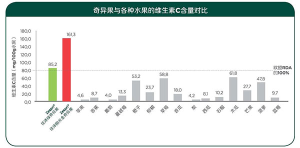 维生素C同样是国民所最为关注的营养素。因维生素C具有抗氧化的功效,能修复细胞损害,增强人体抵抗力,对大众关注的心血管、动脉硬化等各种成人病具有重要意义。新版中国居民膳食指南更指出:推荐成人每日应摄入100毫克维生素C,而蔬果更是维生素C的主要食物来源。所以普遍很多人会选择橙子作为补充维生素C的水果,认为其维生素的含量很高。其实在同等重量下, Zespri®佳沛新西兰阳光金果的维生素C含量是橙子的3倍,只需每天一颗奇异果就能提供一天人体所需的维生素C的含量。