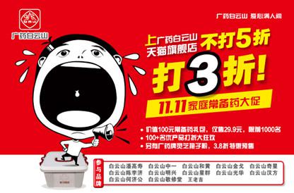 此外,为了配合双十一活动,反馈一直支持广药白云山的忠实消费者,广药白云山还在微信官方服务号商城和天猫旗舰店上推出了1元秒杀和3元秒杀活动。消费者只需在11月1日-11日每天上午10点登陆广药白云山微信官方服务号商城就可以1元的低价秒杀到明兴清开灵颗粒、星群夏桑菊颗粒、潘高寿治咳川贝枇杷露、王老吉润喉糖、白云山六味地黄丸、奇星珍珠末、白云山感冒灵颗粒、奇星虚汗停颗粒、白云山安神补脑液、陈李济咳喘顺丸10种原价11.5-128元的日常家居药品(每天一款产品);同时,在11月11日0时登陆广药白云山天猫旗舰店还可以3元的低价秒杀到众多优质产品。