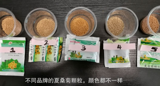 图片中可明显看出,5号夏桑菊颗粒的颜色最深,呈深褐色,颗粒偏长;2号夏桑菊颗粒的颜色最浅,呈浅灰色,颗粒大小不一;而3号白云山星群夏桑菊颗粒的色泽黄亮,跟中草药研制后的颜色一样,颗粒大小也最均匀。