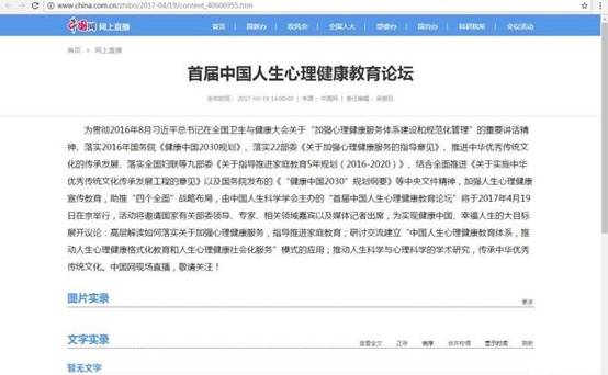 中国网讯 为贯彻2016年8月习近平总书记在全国卫生与健康大会关于“加强心理健康服务体系建设和规范化管理”的重要讲话精神、落实2016年国务院《健康中国2030规划》、落实22部委《关于加强心理健康服务的指导意见》、推进中华优秀传统文化的传承发展、落实全国妇联等九部委《关于指导推进家庭教育5年规划(2016-2020)》、结合全面推进《关于实施中华优秀传统文化传承发展工程的意见》以及国务院发布的《“健康中国2030”规划纲要》等中央文件精神,加强人生心理健康宣传教育,助推“四个全面”战略布局,由中国人生科学学会主办的“首届中国人生心理健康教育论坛”将于2017年4月19日在京举行,活动将邀请国家有关部委领导、专家、相关领域嘉宾以及媒体记者出席,为实现健康中国、幸福人生的大目标展开议论:高层解读如何落实关于加强心理健康服务,指导推进家庭教育;研讨交流建立“中国人生心理健康教育体系,推动人生心理健康格式化教育和人生心理健康社会化服务”模式的应用;推动人生科学与心理科学的学术研究,传承中华优秀传统文化。中国网现场直播,敬请关注!(中国网 吴仕鹏)