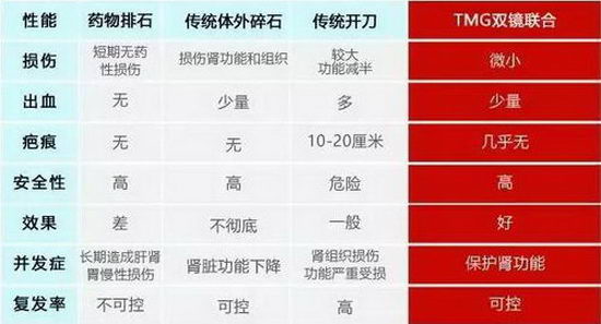 进入21世纪,微创成为医学发展的方向和重点,TMG双镜联合微创保肾取石术是基于传统疗法成功率低,取石不干净、复发率高,对肾脏损伤大、出血多、手术、住院时间长、恢复慢等缺点研究而成,此疗法大大提高了结石的取净率,又消除传统疗法给患者带来的伤害和不便。