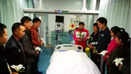 10月17日16时许,河池市红十字会在医院举行了小型告别仪式,社会各界人士40多人参加,并向杨再栋老人敬献了百合花。王国秀俯下身凝视着陪伴自己一生的丈夫,轻轻地把百合花放在丈夫的身上,泪水瞬间夺眶而出。“老杨,你放心地走吧,我和儿子已经按照你的遗愿,捐献了你的器官。”王国秀双眼噙泪说。