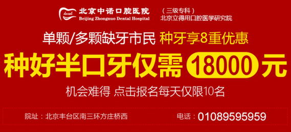 北京三级口腔医院—北京中诺口腔医院特邀北京口腔医院、第四军医大学、美国哈佛大学等众多口腔种植专家举办“2017年北京种植牙大型专家会诊活动暨立得用体系再次升级”,针对数万成功种植案例的数据分析及术后康复的情况,根据东方人的口腔情况、高龄老人特异化体质、疑难口腔种植环境,优化种植方案,对立得用种植牙体系再次升级,同时,引进德、美、瑞典、瑞士等国际一线种植牙品牌如ITI、ICX、Noble等都将参与本次学术盛会活动,针对半口、全口牙齿缺失,种好半口牙仅需18000元。学术会议开展近一周来,预约种牙的中老年人都排起了长队,部分种植牙专家的号位已经需要提前10天预约;为保证种牙的品质,特惠半口种牙名额每天仅限10名,望广大牙齿缺失的中老年人提前拨打电话预约。