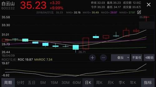 白云山4月26日公布了18年一季报:公司营业收入69.09亿,同比增长30.66%;归母净利润9.05亿元,同比增长86.76%,扣非净利润8.72亿元,同比增长88.89%,对应每股盈利0.557元,同比增长86.91%,远超市场预期。受此消息影响,近期表现强势的白云山(600332)再度涨停,股价以35.23元报收,创近三年以来的新高。