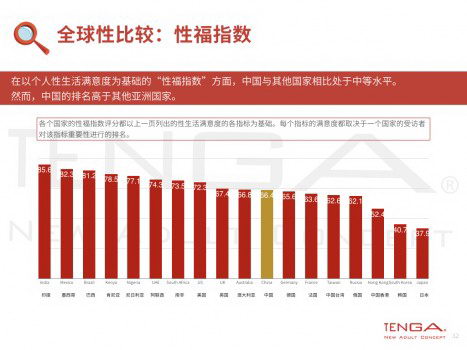 全球调查显示,在以个人性生活满意度为基础的“性福指数”方面,中国的满意程度为66.4%。与其他国家相比,该数值处于中等水平,但已经是亚洲地区的第一名,排在最末的却是色情产业发达的日本。