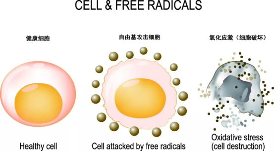 自由基是一类具有高度活性的物质,在细胞代谢过程中会连续不断地产生。正常情况下,自由基具有调节细胞间的信号传递和细胞生长、抑制病毒和细菌的作用。但如果体内自由基过多,则可产生强氧化作用毒害细胞组织,导致细胞和组织器官损伤,诱发各种疾病,并加速机体衰老。