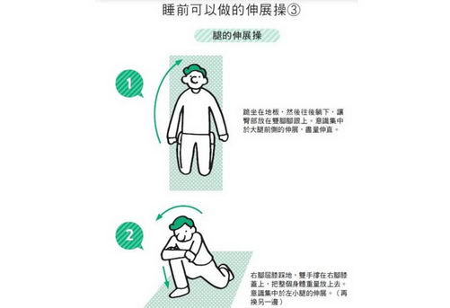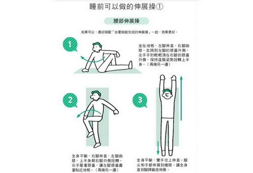 除了坐着做4个伸展操,也可以在睡前做3招伸展操,减缓一天下来肌肉所累积的疲倦感,还能调整自律神经功能。消除或松缓肌肉的紧张感与僵硬感,对于在睡觉的时候消除疲劳很有帮助。明明很累却什么都不做就上床睡觉,以及做了伸展操后再睡觉,这两种情况的翌日倦怠感会截然不同,后者还可以预防倦怠感日积月累。