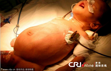 昨日上午,妹妹安静地躺在省医院儿童医学中心病床上睡觉,比成人双拳还大的肿瘤,让妹妹的屁股已经严重变形,看起来比她的头还大两圈!妹妹的外婆邹公芬称,女儿怀孕时曾做过3次B超,每次都被告知一切正常。不过,宝宝出生当天,却把县医院接生的医护人员给吓了一跳,“屁股变形了,他们都弄不清是男孩还是女孩。”邹公芬说,当时连跑几家医院都没敢收治病重的妹妹。