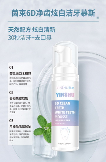 一个干净的口腔离不开清洁,小编今天给大家介绍一款全新的口腔清理神器,牙膏+漱口水双效合一的洁牙慕斯,茵束6D净齿炫白洁牙慕斯,快速美白牙齿,抗菌抑菌,解决口腔问题。可以亮白去黄、清洁口腔、抗菌清新8小时、改善牙龈问题、健康口腔环境、帮助出血伤口愈合!