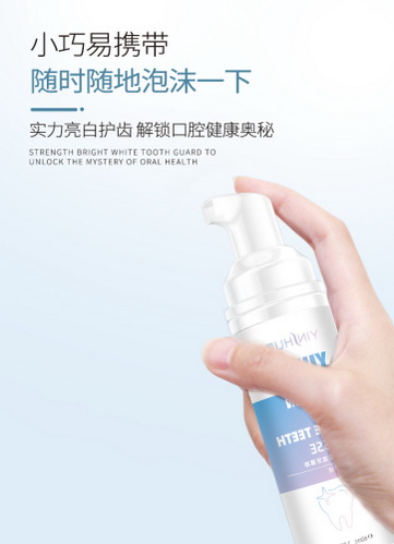 这款洁牙慕斯是泡沫状,泡沫细腻,味道清新。随着你的漱口或者刷牙动作,绵密的慕斯泡泡深入牙缝等深处,360度多方位清洁口腔,带走口腔内食物残留。