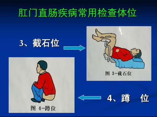 患者下蹲作深呼吸,用力增加腹压,作排便状,适用检查直肠脱垂、直肠息肉、痔脱出和直肠肿瘤位置稍高的患者。