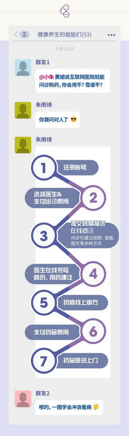 在这个群里,大家也许没跟上最近的八卦热搜,但永远把住了最“时髦”的健康讯息。同时,疫情的突袭让很多事转战线上,更让群友们对“时髦”的互联网医院有了深入的了解: