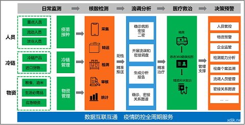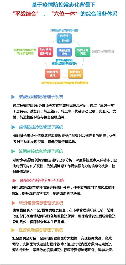 “疫情防控综合服务平台”以提升疫情防控能力、建立“平战结合”、“六位一体”的疫情防控综合服务体系为目标,以数据互联互通为基础,实现疫情防控全周期服务。