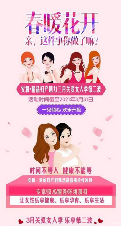 你负责貌美如花,我们负责维护健康!三月女神季,安和爱的妇产科关爱女性健康新升级,乐享健康第二波向你袭来~贴心钜惠,只为宠爱你!