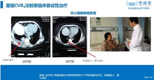 重组CVB3注射液临床尝试性治疗案例:非小细胞癌患者,男,48岁。肺癌晚期治疗前,咳嗽咳血,胸闷有腹水,使用一个疗程溶留治疗后,肿瘤控制,无咳血咳嗽现象,胸水减少,食欲好转,用药前后心电图无明显变化。翟女士,67岁肺癌患者,治疗前肿瘤和胸水非常明显,使用两个疗程溶瘤治疗后,肿瘤缩小,胸水消失。