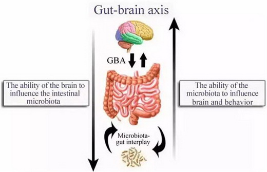 人体的消化道中,存在着5亿多个神经细胞,就好比是大脑中的神经元,神经元与神经元彼此之间共同协作、互动交流,形成了“肠脑”系统,它是我们自主自治的第二大脑。肠脑能有效控制我们人体的肠道肌肉收缩、腺体分泌、调节细胞活性,同时还可以有效地帮助我们平衡饥饿感和饱腹感,并在处理完毕之后,将整个状态的全部信息传输给大脑;反过来大脑也可以调节局部肠道的蠕动、分泌以及通透性,并通过直接调节微生物基因表达,影响肠道微生物的群落(肠道菌群)结构和功能。肠脑与大脑,就形成了一个可以互动的肠-脑轴(The Brain-Gut Axis),而且研究证实,肠脑对大脑的影响控制力,明显大于大脑对肠脑的影响控制力。