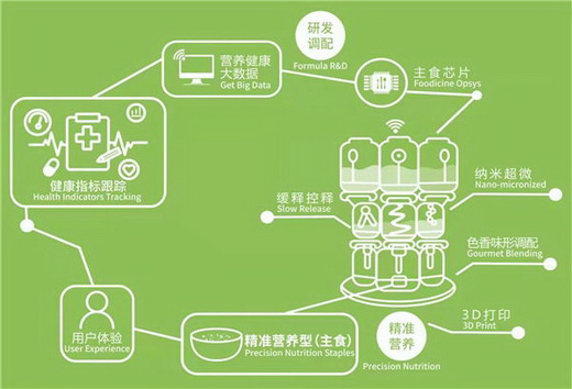 食品加工制造的尖端精密机械技术,与人工智能、统计学和人体营养大数据的跨界结合,产生了食物定制化生产的主食芯片3D技术,其中包含可使主食中营养特素在消化吸收过程中,实现“缓释”的相关专利技术。这项全球独创领先的食品营养技术,在全球目前已经产生了诸如燕粟配方谷粮、豹米果粮等既美味又健康的新品类主粮。