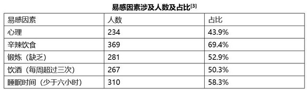 脂溢性皮炎受多种因素影响,其中,影响最为严重的有五种,分别为心理、辛辣饮食、锻炼、饮酒、睡眠时间。有研究取532例出现头屑、头痒、爱出油症状的脂溢性皮炎患者,研究上述易感因素的出现比例,可见下表[3]。