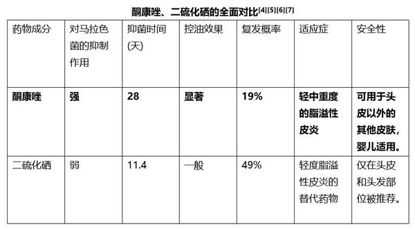 有效缓解头屑、头痒、爱出油情况,首先要加强清洁,避免皮肤过于油腻,建议正确使用发用洗剂。治疗脂溢性皮炎的发用洗剂,常见酮康唑、二硫化硒,现从抑菌效果、抑菌时间、控油效果/复发概率、适应症、安全性等方面对其进行比较[4][5][6][7]。