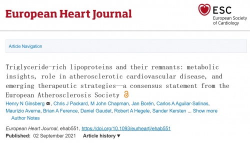 2021年欧洲心脏病学会年会(ESC 2021)近期圆满落下帷幕。9月2日,欧洲心脏病学会官方会刊《欧洲心脏杂志》发布《2021 欧洲动脉粥样硬化学会(EAS)共识声明:富含甘油三酯的脂蛋白及其残余物——代谢观察、在动脉硬化性心血管疾病中的作用及新兴治疗策略》[1](以下简称《共识》),强调了甘油三酯(TG)在动脉硬化性心血管疾病(ASCVD)管理中的重要地位,与此同时,《共识》引用此前一项备受瞩目REDUCE-IT研究结果指出,高纯度二十碳五烯酸(EPA)单分子处方药——二十碳五烯酸乙酯(IPE)可显著降低TG水平,在大众最常见他汀类药物基础上进一步降低心血管事件风险,包括心血管死亡、非致死性心肌梗死、非致死性卒中、冠脉血运重建和不稳定型心绞痛等。