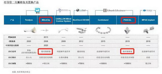 全球已经上市的二尖瓣缘对缘修复产品包括MitraClip和PASCAL,目前全球已有超10万名MR患者接受了MitraClip治疗。在国际市场上,MitraClip相对来说最为成熟。PASCAL由美国的爱德华生命科学研发,目前仅获得CE批准,其设计原理类似MitraClip。