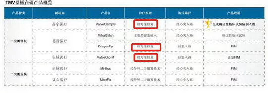 而目前中国国内共3款用于二尖瓣缘对缘修复的产品已进入上市前确证性临床阶段,分别是捍宇医疗的ValveClamp(2019年2月启动确证性临床)、德晋医疗的DragonFly(2021年5月启动确证性临床)以及纽脉医疗的ValueClip-M(2021年8月启动确证性临床)。