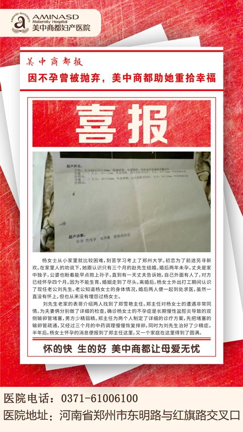 刘先生老家的表哥介绍两人找到了郑雪艳主任。郑主任对杨女士的遭遇非常同情。为夫妻俩分别做了详细的检查,确诊杨女士的不孕症是长期慢性盆腔炎导致的双侧输卵管堵塞,男方少精弱精。郑主任为两个人制定了详细的诊疗方案,先把堵塞的输卵管疏通,又经过三个月的中药调理慢慢恢复排卵,同时为刘先生治好了少精症。半年后,杨女士怀孕的消息便报到了郑主任这里,又一个家庭在这里得到了圆滿。