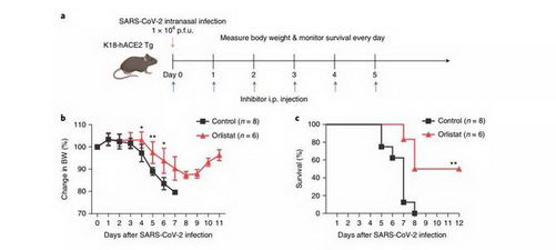 这些结果表明奥利司他治疗具有较强的体内抗SARS-CoV-2活性,抑制肺部炎症和疾病进展,并保护感染后的宿主存活,从而为治疗COVID-19提供了一个有希望的临床候选方案。