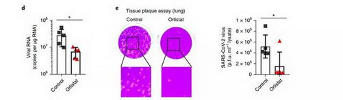 奥利司他治疗抑制了SARS-CoV-2在肺组织中复制,病毒RNA量(图3d)和感染性病毒滴度(图3e)显著降低。一贯的组织病理学分析还显示,与溶媒治疗小鼠相比,奥利司他治疗小鼠的肺部炎症减轻(图3def)使用不同的动物模型也获得了类似的结果。