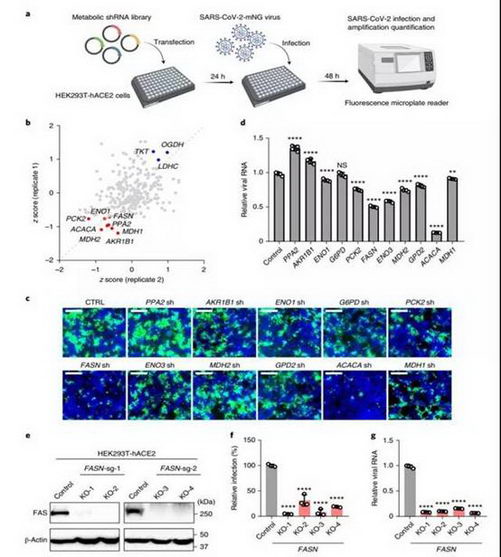 王荣福团队首先筛选HEK293T-hACE2(稳定表达人ACE2)中95个代谢基因的短发夹(sh)RNA文库,确认了SARS-CoV-2病毒感染和复制与抑制脂肪酸合成途径相关。之后通过选择人肺细胞系(NCI-H1355和NCI-H1437)、人结肠细胞系(Caco-2)和稳定表达hACE2的小鼠胚胎成纤维细胞(MEF-hACE2)使用选定的FAS抑制剂,结果表明FAS抑制剂(以奥利司他为代表)能有效抑制几个受试细胞系中的SARS-CoV-2感染和复制。