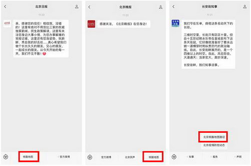 此外,点击“北京日报”“北京晚报”“长安街知事”等微信公众号菜单栏,进入“北京核酸检测地图”,也可实现核酸检测机构查询、报告查询等服务。