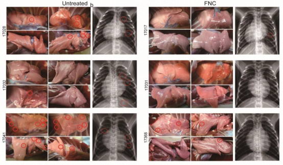 对于新冠病毒最主要侵袭的靶器官——肺,未治疗组肉眼可见肺部出血点,胸片上也明显可见肺部毛玻璃样病变。相比之下,用阿兹夫定治疗的恒河猴,所有的肺部病变都得到了非常有效的缓解。