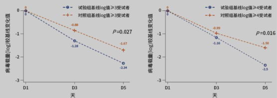 在疗效指标——病毒载量较基线变化上,log值≥3及log值≥4的受试者在第5天病毒载量下降值均大于对照组,具有统计学差异。