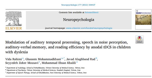 Rahimi V, Mohammadkhani G, Rad J A, et al. Modulation of auditory temporal processing, speech in noise perception, auditory-verbal memory, and reading efficiency by anodal tDCS in children with dyslexia[J]. Neuropsychologia, 2022: 108427.