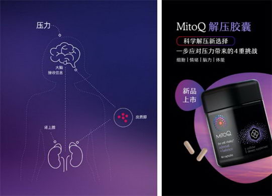 MitoQ解压胶囊,帮助消费者科学应对压力带来的情绪负担、脑力负担、肌肉负担以及细胞压力的四重机能挑战,助力压力缓解,对抗疲劳,提升六大外在表现。