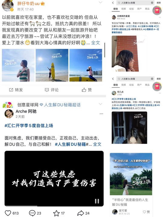 同学们也接住了爱与期待的接力棒,受感于片中男主人公西腊的昂首5°的自信姿态,纷纷参与到5°自信上场的话题讨论当中,或模仿昂首5°的自信状态,或讲述各自不同的人生故事,或用自己的表达方式诠释自信态度,让汇仁开学季的品牌主张,衍生出许许多多生动、鲜活的表达。