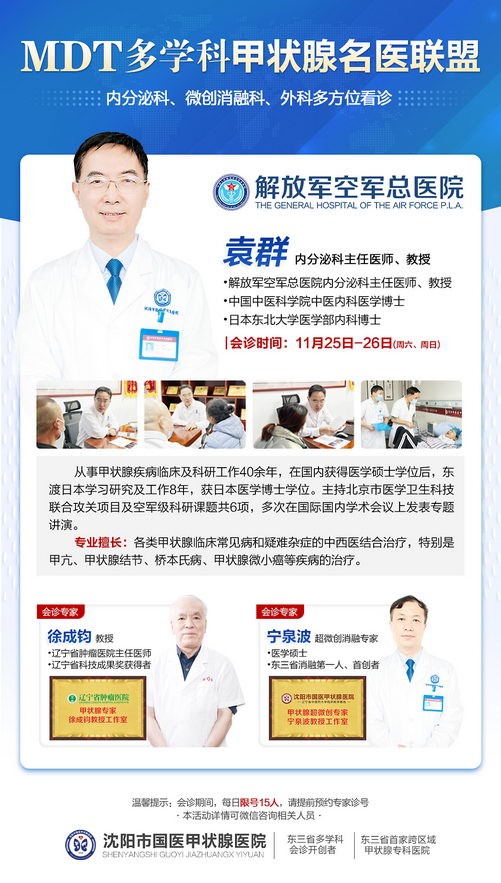 为了解决这一问题,沈阳国医甲状腺医院特邀京辽两位知名专家袁群、宁泉波亲临联合会诊。袁群教授和宁泉波博士均具有丰富的临床经验和深厚的学术背景,在甲状腺疾病的诊疗方面具有较高的声誉和影响力。他们将共同为患者制定个性化的诊疗方案,提供专业的诊疗建议和治疗方案。
