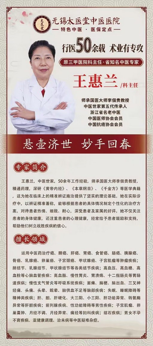 半世纪行医路,一颗仁医心。王惠兰主任用50年的坚守与专注,在无锡太医堂书写着中医的神奇与温暖。无论你是被疑难杂症困扰,还是想进行身体调理,选择无锡太医堂,选择王惠兰主任,便是选择一份经得起时间考验的专业与信赖。让中医智慧为健康护航,让仁心医术驱散病痛阴霾。