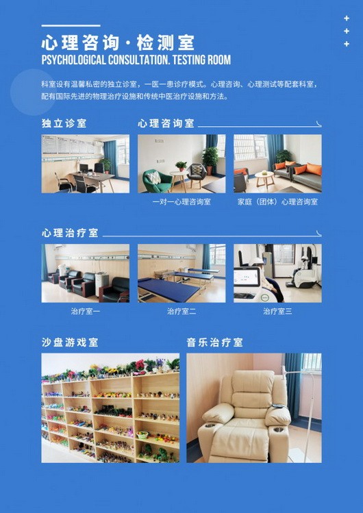 - 独立心理治疗室、沙盘游戏、音乐放松等非药物干预齐全